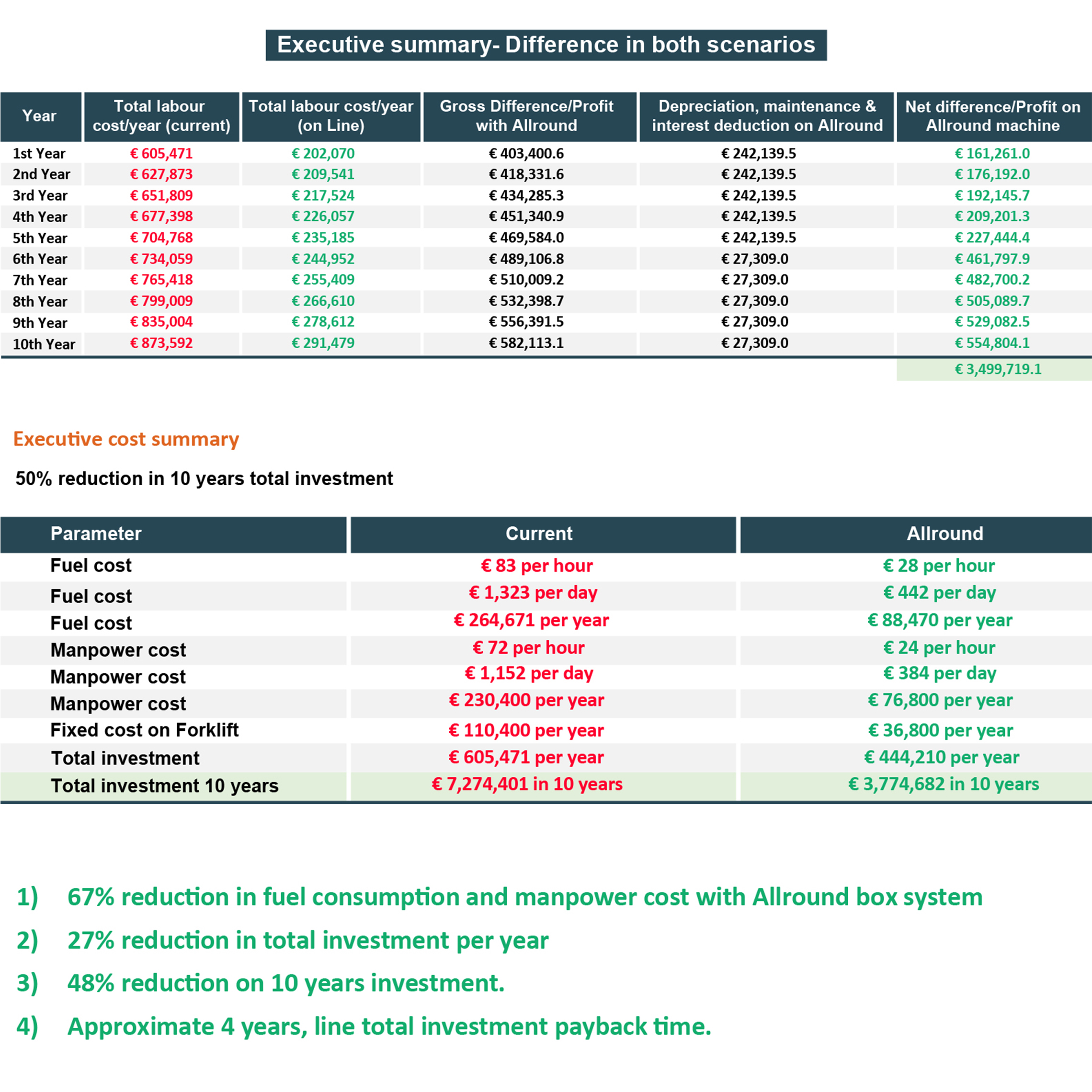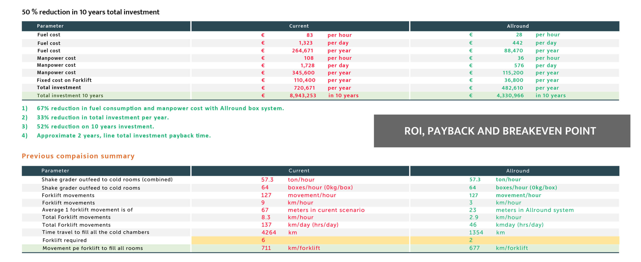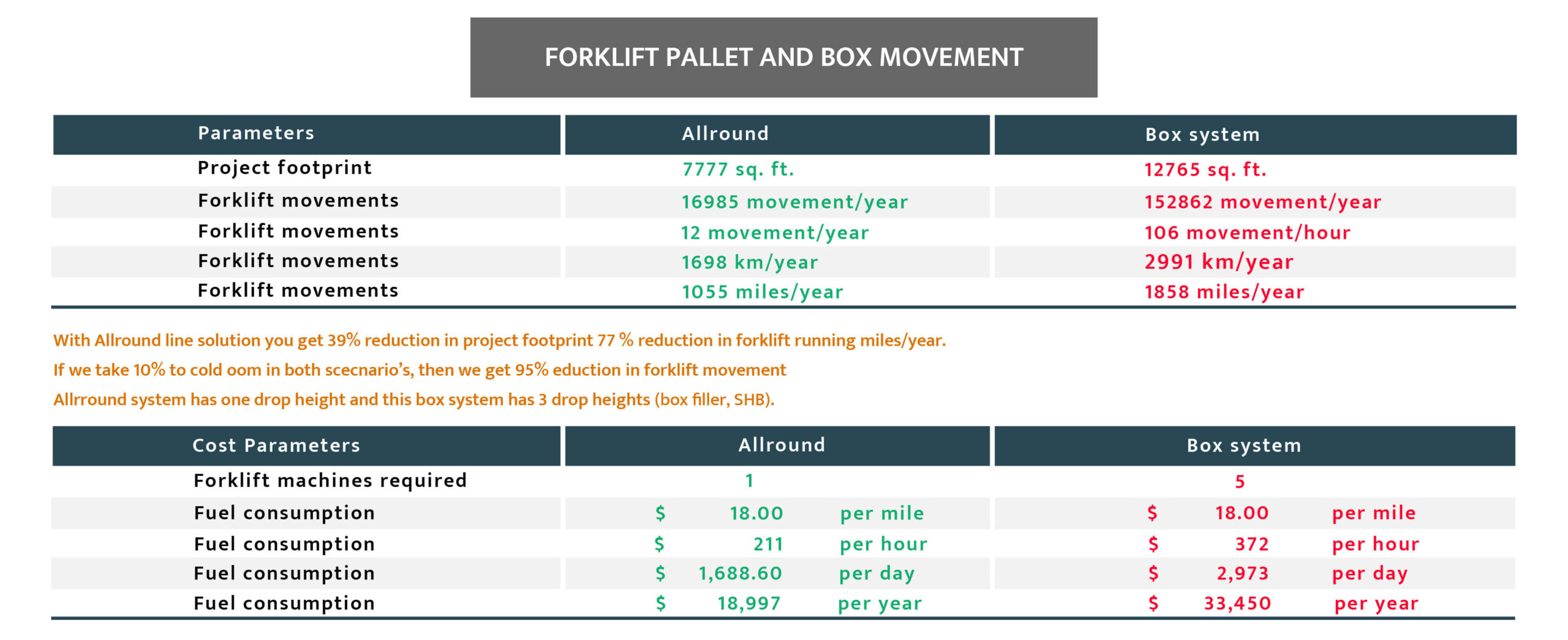 In this section of our calculation models, we analyze your current situation with regard to forklift and box movements as clearly as possible. We draw the current line as much as possible. If possible and necessary, we make a film and photos of your line and way of working. as mentioned earlier in the section on the site about labor saving, the forklift is our figurative enemy. We are going to calculate exactly how many miles each forklift travels per day. How many times do you have a particular box in the forklift. Where can we take the forklift out. This prevents extra drop heights. In the image next to this text you can see an outcome of such an approach. The differences are often astounding. For a pure calculation of the savings, you have to take into account a technical life of up toii and year for the installation.