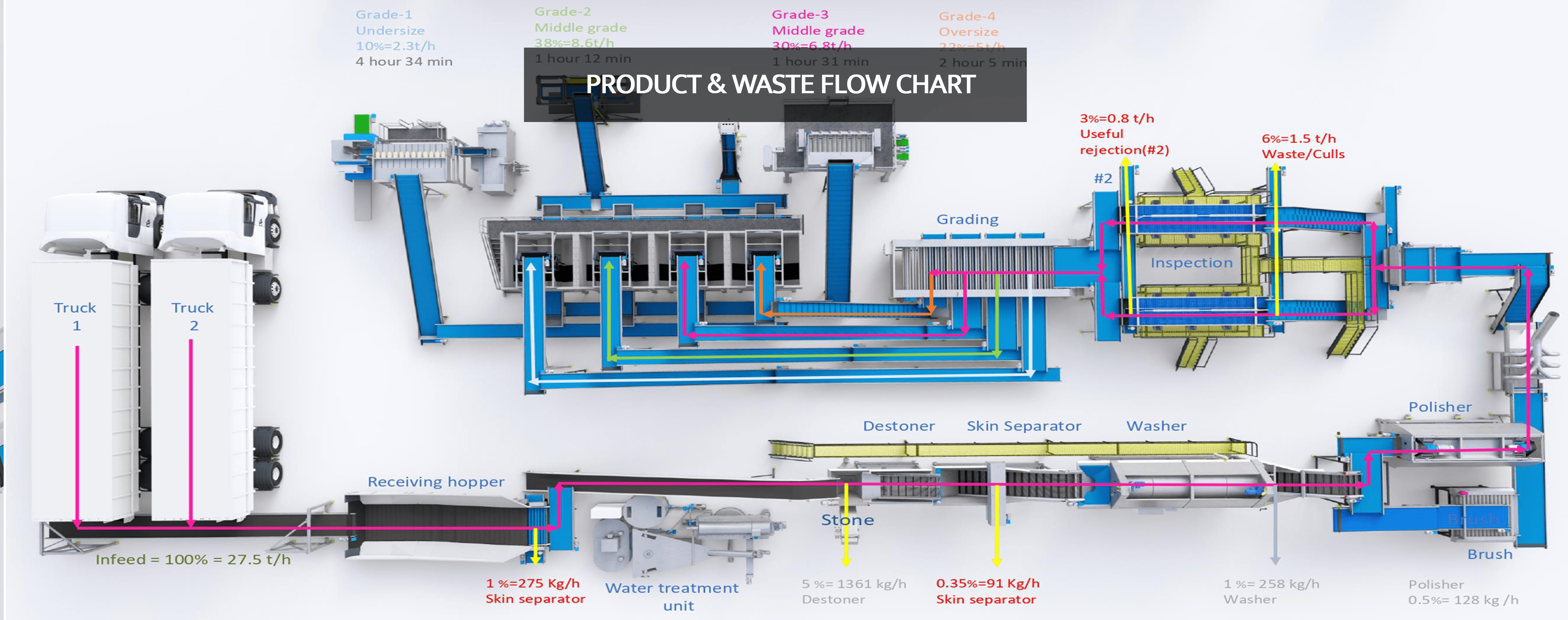 With the product and waste flow chart we show in a drawing what happens to the product from the input, processing, weighing and packaging, palletizing and collecting pallets. Your line/project is a dis-tribution center whether it is large or small. The batch (for example, carrots, potatoes and onions) changes composition at each machine in the line. We can measure and weigh everything from what is happening. For example, how much soil is sieved out at the receiving hopper. We make it clear in the schedule where any bottle necks occur. How much buffer should you keep between the input, pro-cessing, weighing and packaging and shipping. The product or waste streams that are important to you are presented very clearly in drawings, graphs and tables Which form of buffer, boxes or hoppers, is best for you. All these questions become clearer with the help of our dynamic calculation scheme.