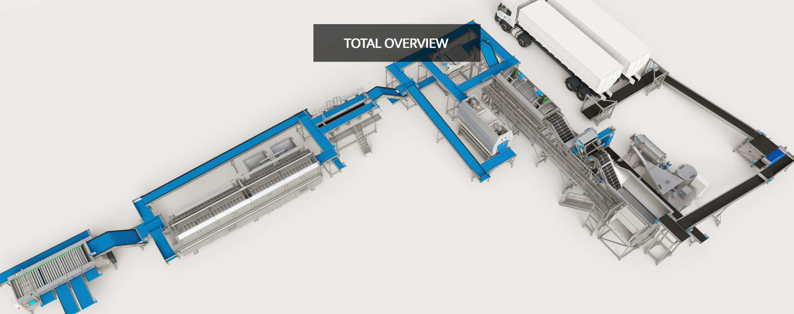 a project to replace an existing multi product line. The new line had to be drawn in an existing building. Inevitably you have problems with doors, heights and electricity connections. In close consultation with the civil contractor, however, these are relatively easy to solve. A clear, unambiguous communication and evaluation is indispensable here. The entire processing of the produce, carrots, red beet and parsnips, had to be modernized. The company is a supplier to a wholesaler of carrots and carrot products and also supplies directly to distribution centers of a supermarket chain. The three crops are grown on a large scale on the farm. About five months a year, the produce are processed directly from the field and delivered daily. The collection of harvested produce for direct delivery is done in potato button belt trucks. The crops are also grown for storage. Throughout the year there is cooperation with suppliers. Both for freshly harvested crops and from storage. The customer was confronted by its customers with a strict new requirement. The carrots and parsnips must be delivered refrigerated per coming season. The only solution is a hydrocooler. A large hydro cooler is part of the project. The Allround hydrocooler is sold all over the world and functions super. The hydrocooler is bypassed when the carrots and parsnips are not needed to be cooled. Another area of great concern is the changing environmental requirements for the use of fresh water and the disposal of used water. We have proposed a completely new water management system. Water use is reduced by up to 95% through a very smart recirculation system. For the packaging and collection of the retail packaging, we have proposed a robotized system. This new system can collect trays and bags in different RPCs at the same time. The RPCs with trays and those with bags are both palletized with an IPLA palletizer and then collected and barcoded from the pallets. We have come up with a nice solution for processing, labor savings and environmental requirements.