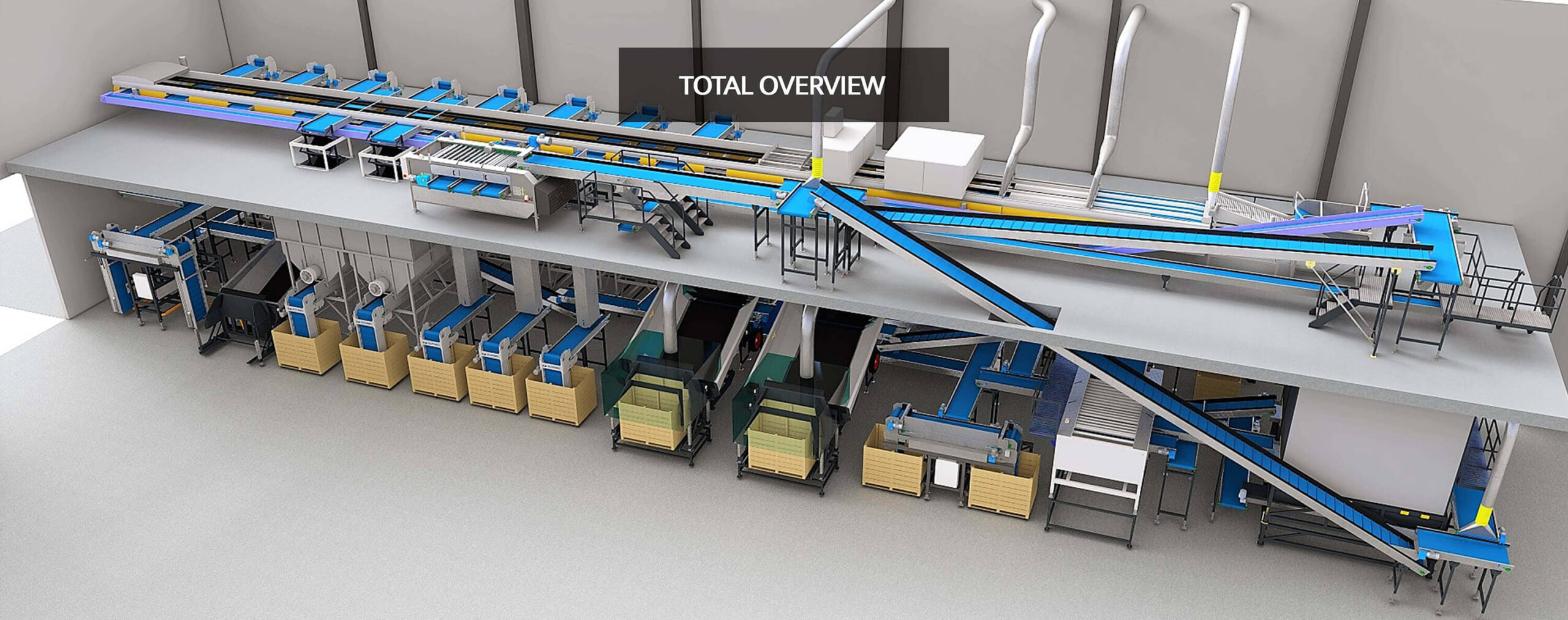 or a customer in Western Europe we delivered a reception, onion topping, grading and optical sorting and weighing and packaging installation. The line is made for processing onions and shallots. So we have created an integrated line for the processing of shallots and onions. The capacity is about seven tons for shallots and fifteen tons per hour for onions. The onions and shallots are supplied from own storage or from suppliers both in cubic boxes. After the reception hoppers an electronic stone separator is placed. Two onion toppers for onion as well as for shallots. A radial grader with three sizes has been placed in front of the onion toppers to achieve the best possible result with as little damage as possible. The onions and shallots are pre-graded in three sizes. Two sizes for the two onion toppers with different sieves sizes and one size for oversize or undersize. Undersized or oversize can be collected in boxes or big bags or disposed of directly to the central waste system, The onions are optically sorted and graded whereas the shallots mechanically with a radial grader with four outlets. The whole is a green field project. The entire installation is placed in a limited space with a mezzanine. The mezzanine has the great advantage that enables to design a perfect logistics system.