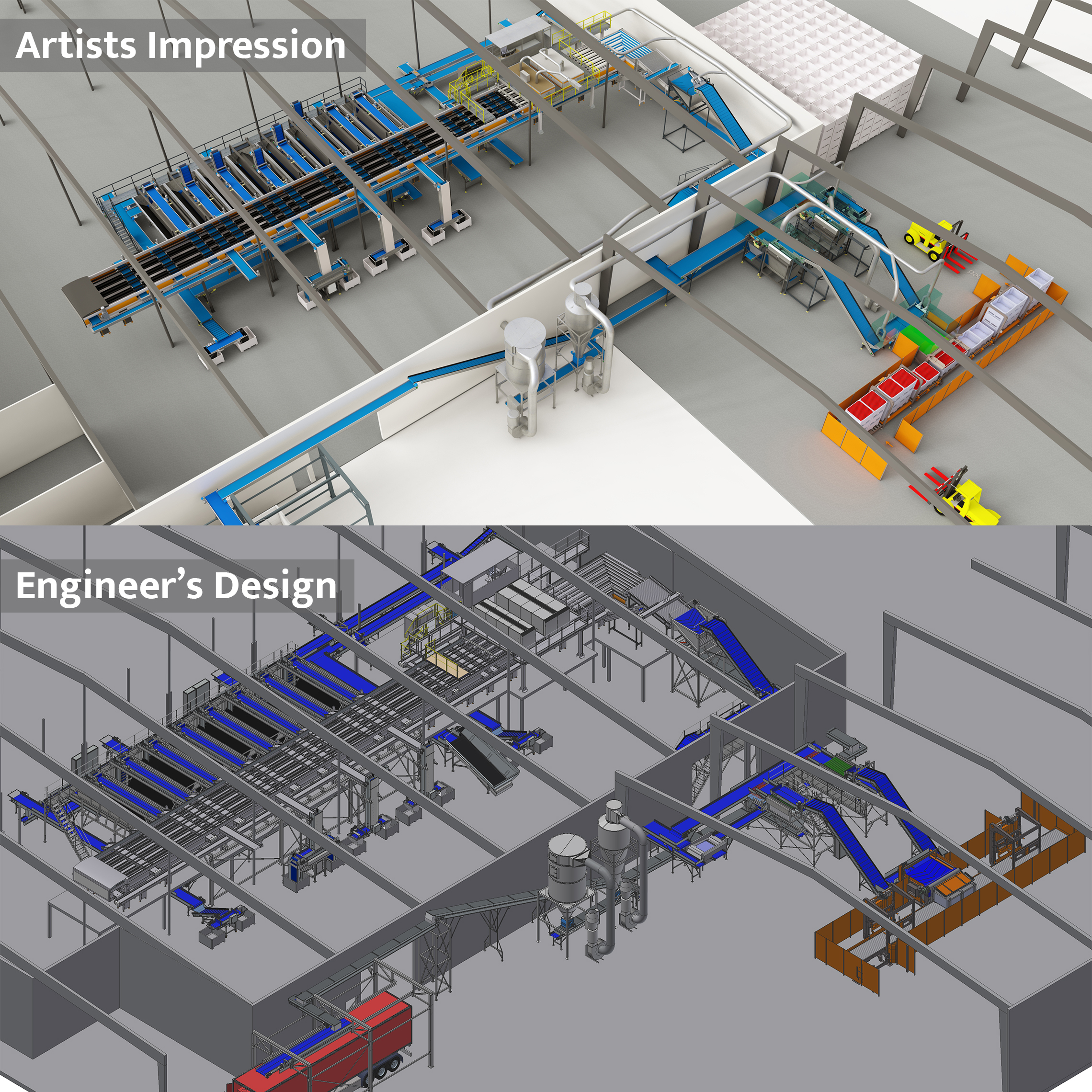 When putting together a line or developing a greenfield project, one or more civil contractors are always involved. It is often that we jointly project a building around the installation. In the case of a washing installation, we have to draw up a plan for water management together. The entire supply, drainage and recirculation must be fully mapped before the new or renovation starts. Another essential point is the supply of electricity. We always make a complete overview of the Full Load of Amperage (FLA) of the entire installation. Where should the connections with which amperage for the different parts of the line or installation be located? Where do the different electrical panels will be situated? Can the various components such as dust extraction, weighing and packaging and palletizing be integrated into a central panel? All these questions are addressed at an early stage in our joint meetings. In the drawing, we can jointly draw up a plan with the electricity contractor for the cabling with the necessary cable ducts. When the project is in an existing building, there must be a very detailed plan/ drawing of this building. We have already placed many installations in seemingly far too small spaces, where we came up with creative solutions. We will be pleased to show you these in a video conference.