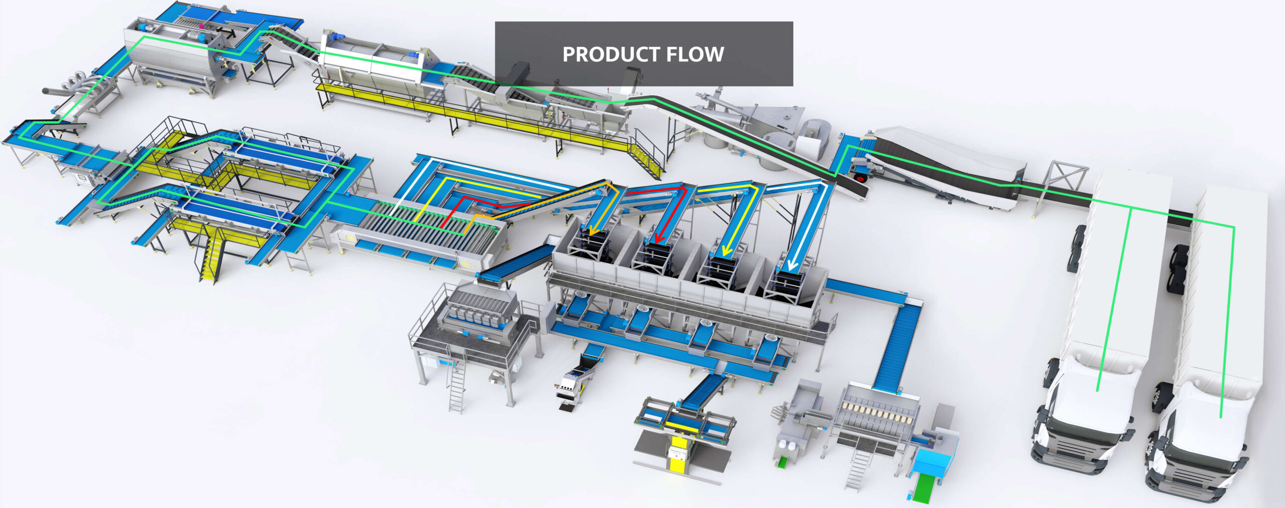 We have developed a distribution center here with an integrated washing and packaging line for sixty tons per hour. After the line, we designed a distribution system. The distribution center can optionally be equipped with gravity roller sets. The project is for a large trader, who processes the potatoes from his own cultivation and from suppliers. There is only storage capacity for a few production days of packaged potatoes. Supplied potatoes cannot be stored, Therefore potatoes must be brought directly from the truck into the line. In this case, we speak of a docking station. The potatoes are delivered in potato trucks. The customer did not have a detailed logistics plan. The storage and shipping of the crops and packaged potatoes was not well organized. That is why we have developed a total plan to visualize the entire production with shipment. In line, we carry out measurements at critical points to keep an eye on efficiency. The efficiency applies to both the truck load, amount of soil and organic waste per ton. How many stones and clods. Quality control per truck. How many people do we need to be able to carry out the manual inspection properly? What is the grading scheme of the delivered potatoes? So we assess each truck whether it has met the contract or the expectations. The way of sorting and grading is mechanical. The reason for this is that the potatoes are supplied fresh. The line works about four months a year.